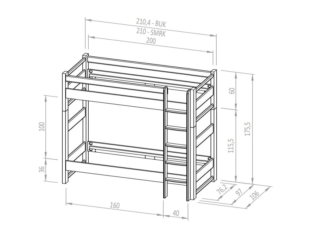 - výška uložení roštu: 27cm dole, 141,5cm nahoře Pro dodržení bezpečnosti je nutné použít laťový rošt a matraci s maximální tloušťkou 15cm. Prostor mezi lůžky: 100cm