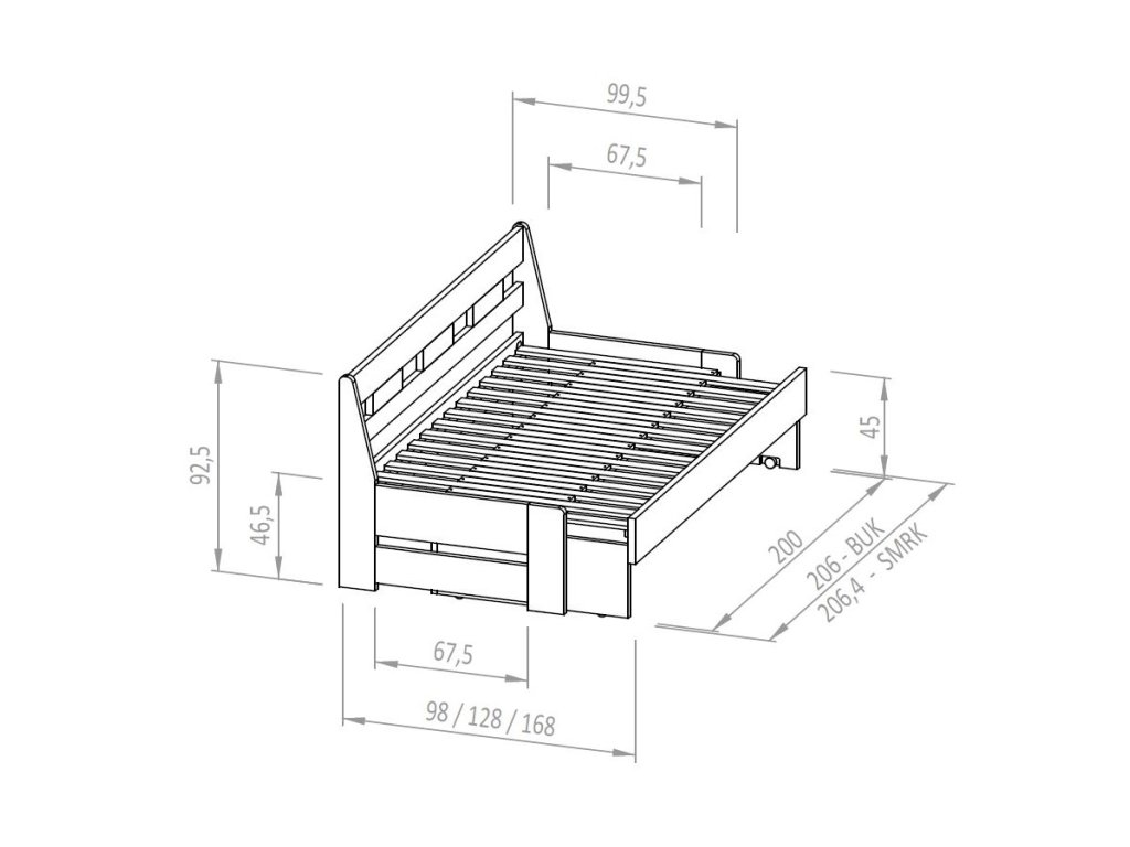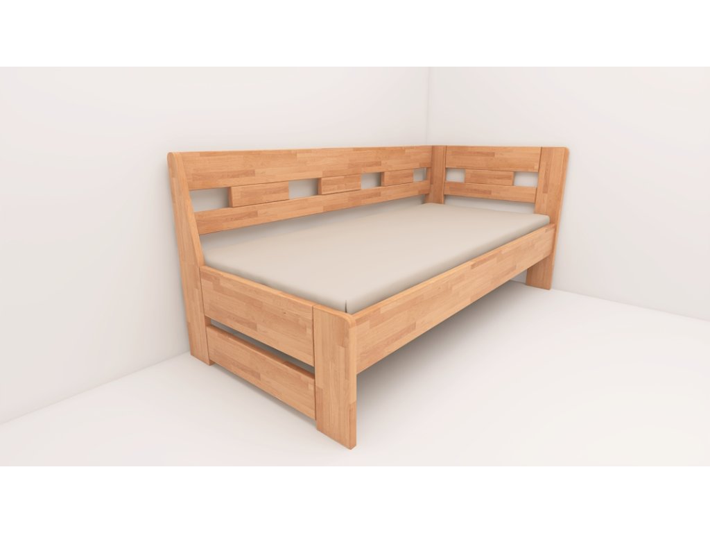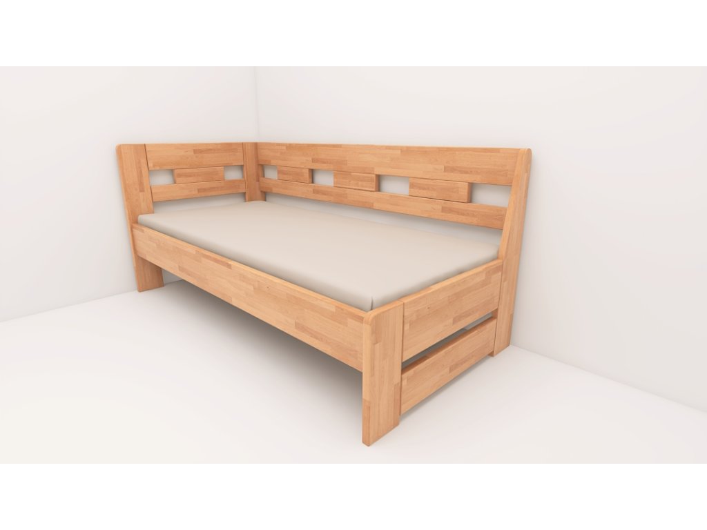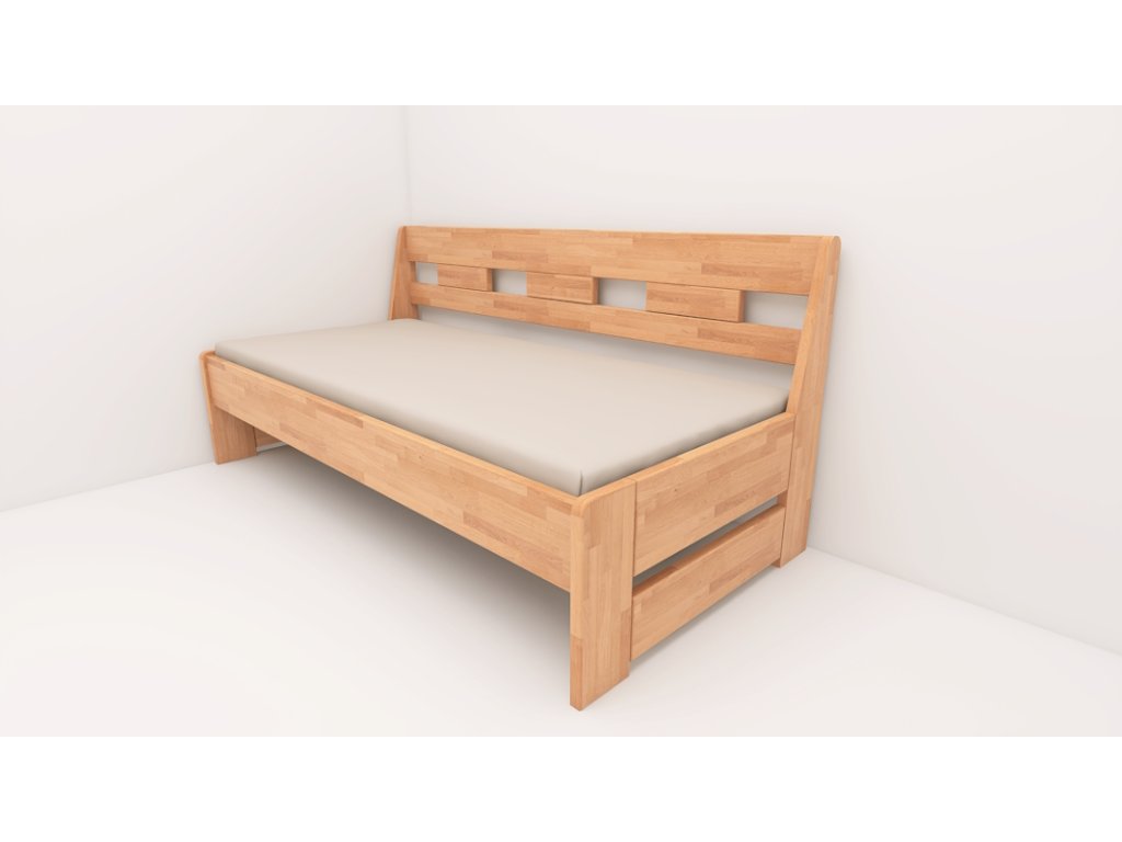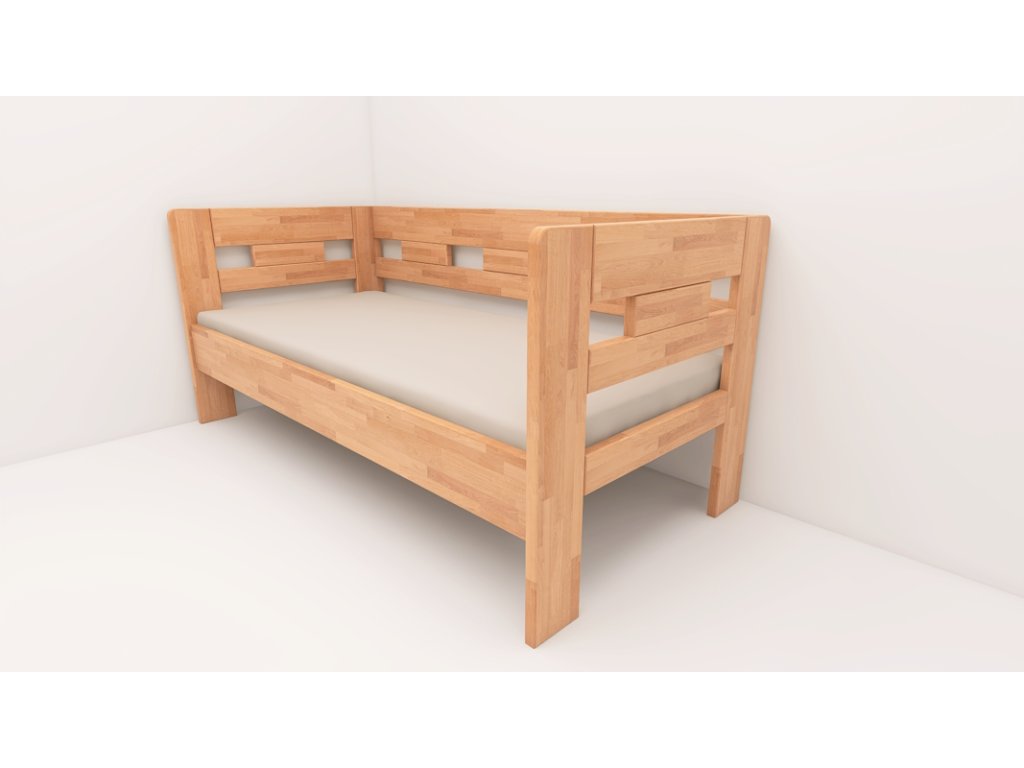 Postel vyrobena z bukového masivu. Rozkládací lůžko v rozměrech 90 až 160x200. Dodává se včetně bukového roštu. Nohy z 30mm masivu a vodorovné výplně 30mm. Všechny vnější hrany postele zaoblené. Možnost polohování výšky uložení roštu. Povrchově upraveno bezbarvým UV lakem s vysokou odolností a barevnou stálostí s možností moření.